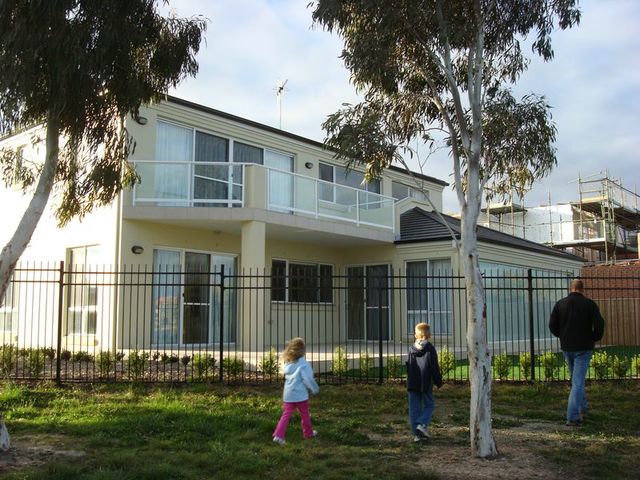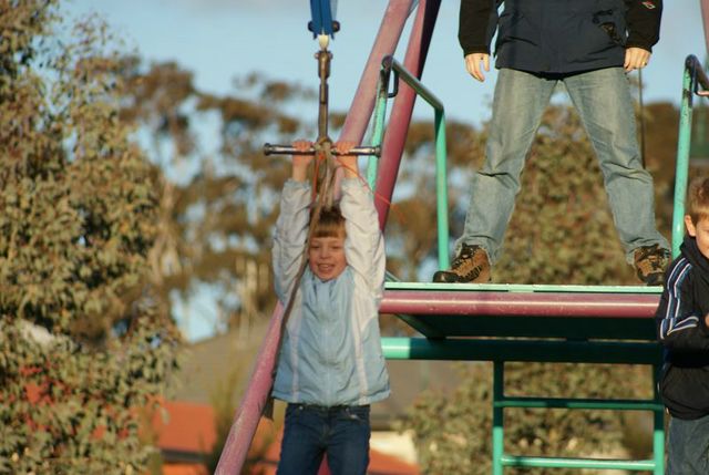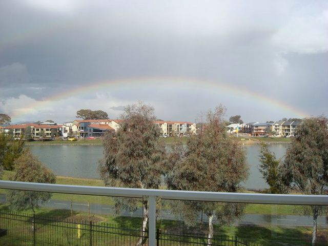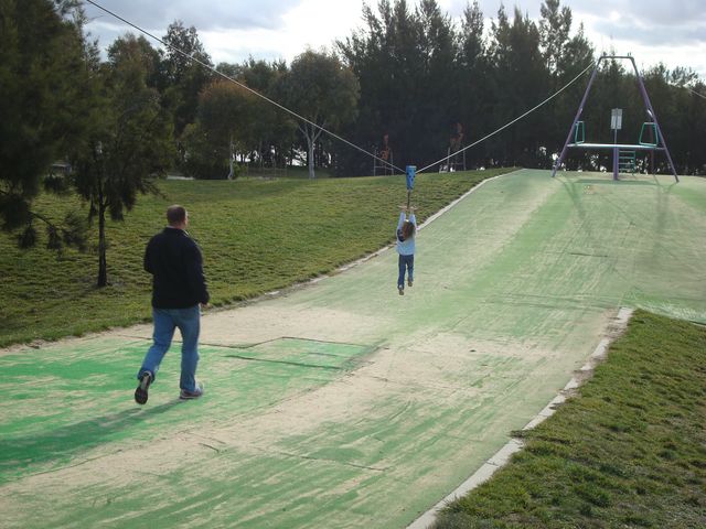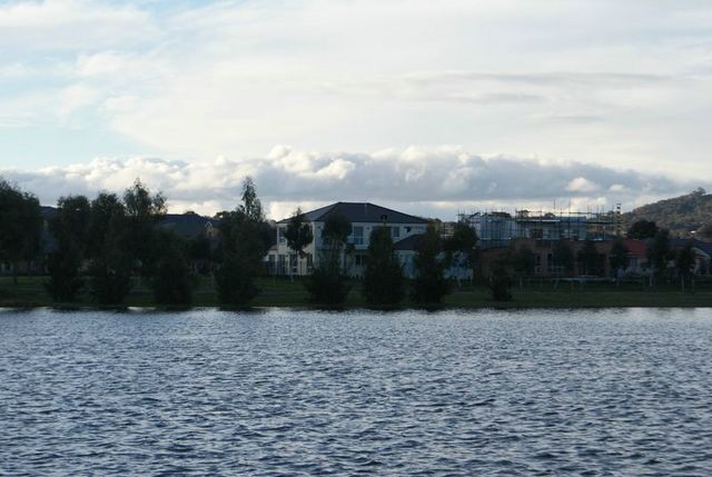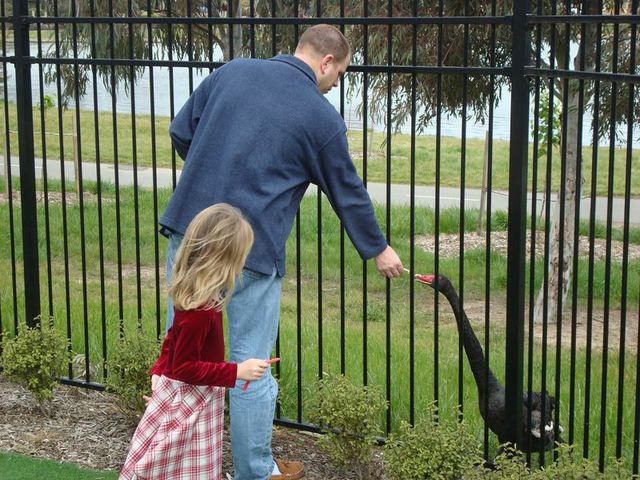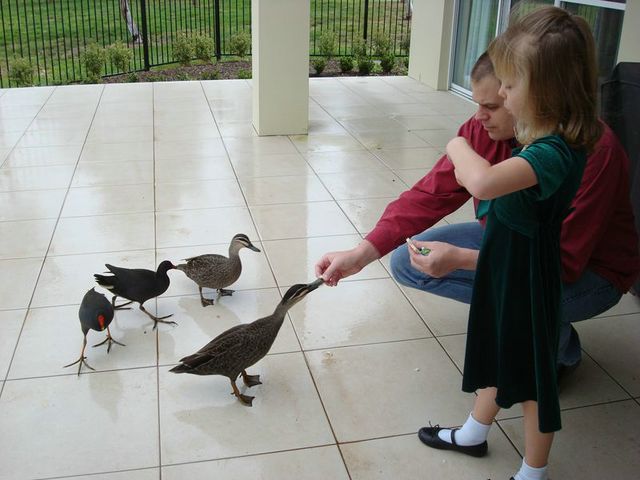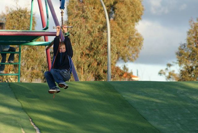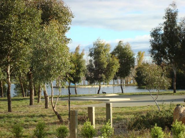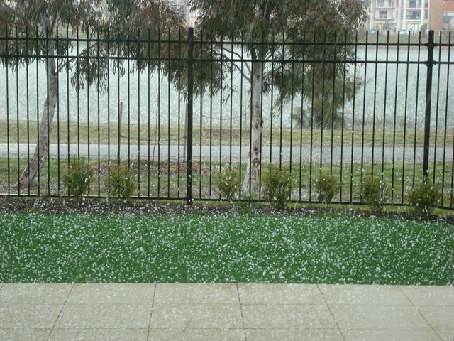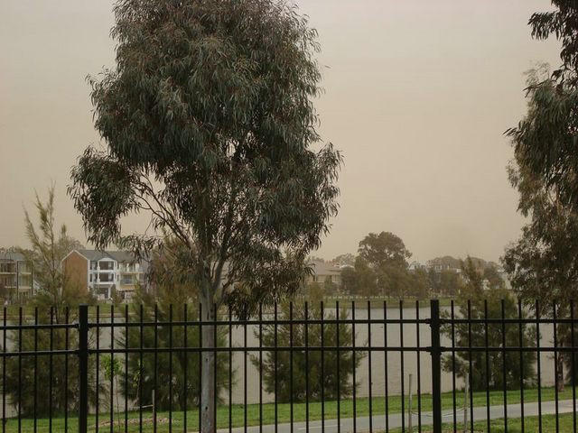Our rental house in the Canberra suburb of Amaroo. We are particularly fond of the fake grass (which is becoming popular due to the drought conditions and water restrictions).A view of the back.We have an open area next to our house.A view of our house from across the lake.A view from our balcony.Zip lines at the adventure park located across the lake.Both kids love it!Whee!An Eastern Rosella in one of the trees by our house.A Dusky Moorhen, Eurasian Coot, and two Pacific Black Ducks get fed on our back patio.“Larry” the Black Swan comes regularly for a handout.On September 22, the skies turned red with dust swept up from the central Australian outback. It lasted for over a day and covered much of the eastern third of the continent in a fine layer of red dust (which is still on our patio).A hail storm blanketing our Astroturf.