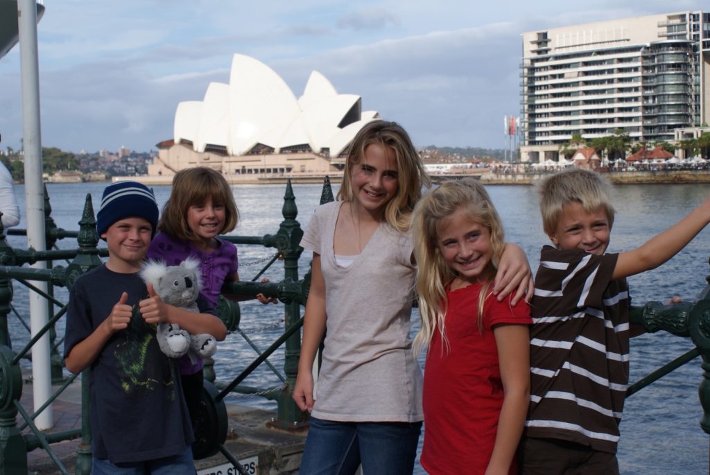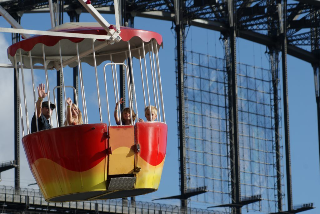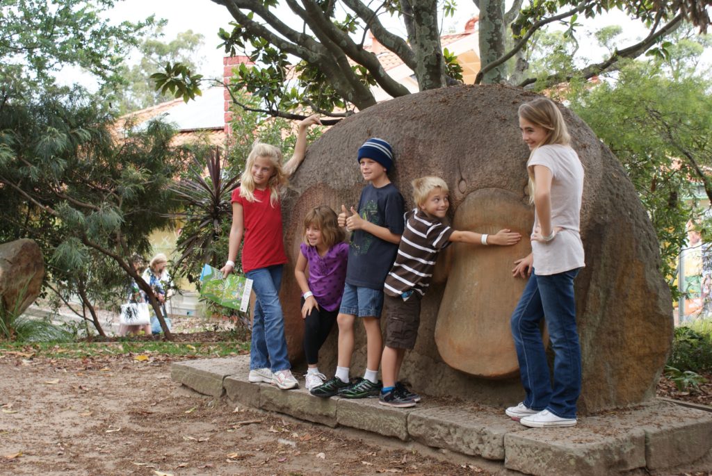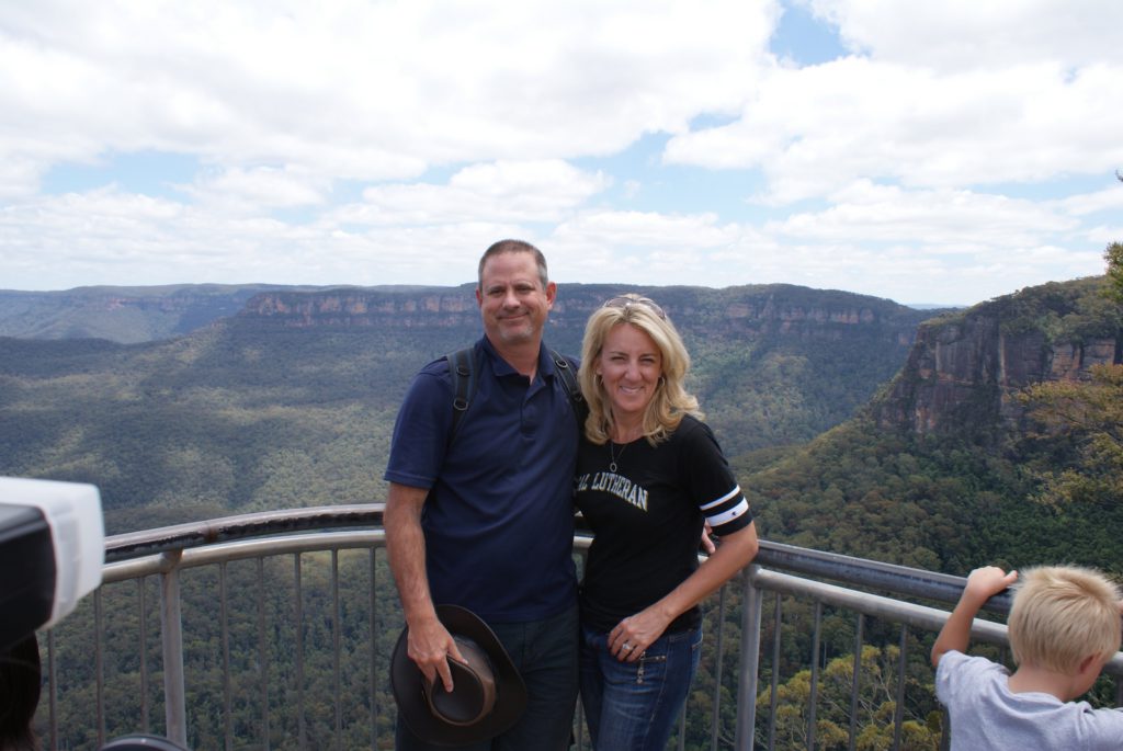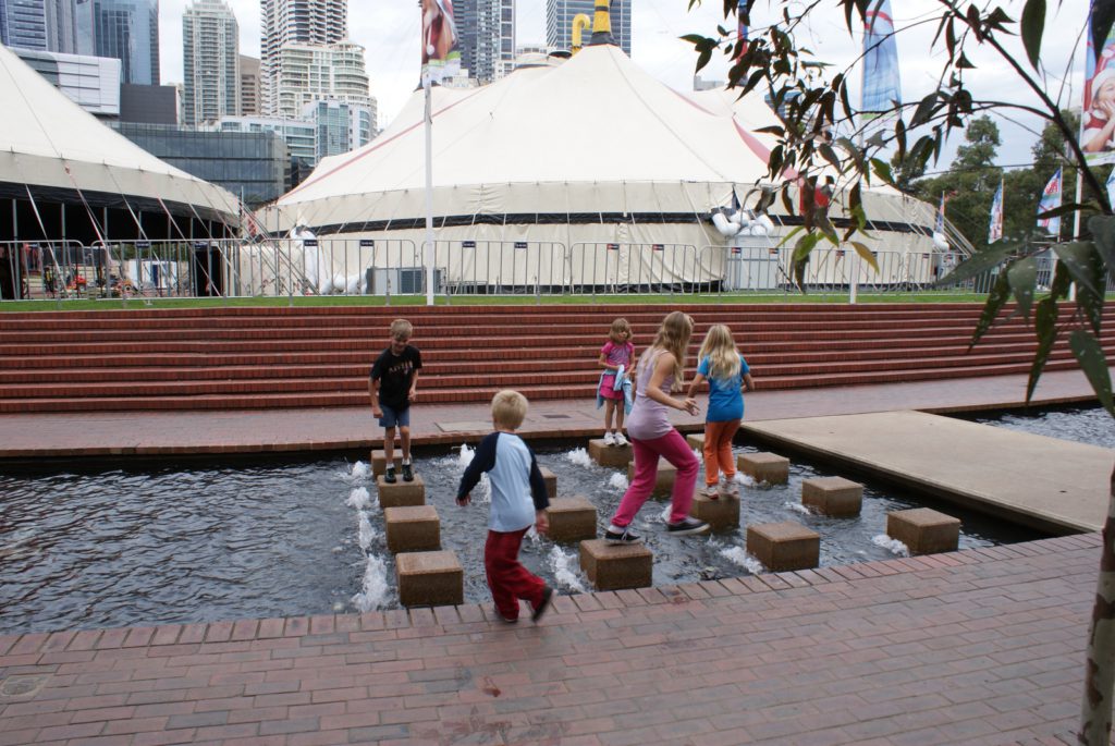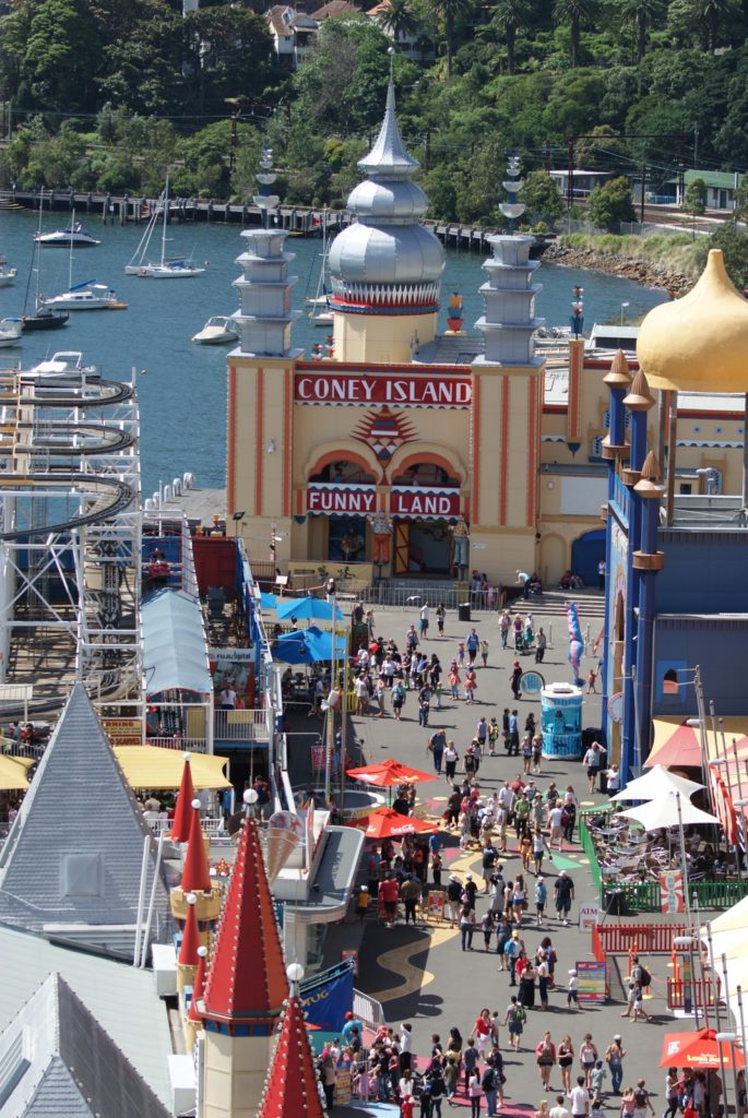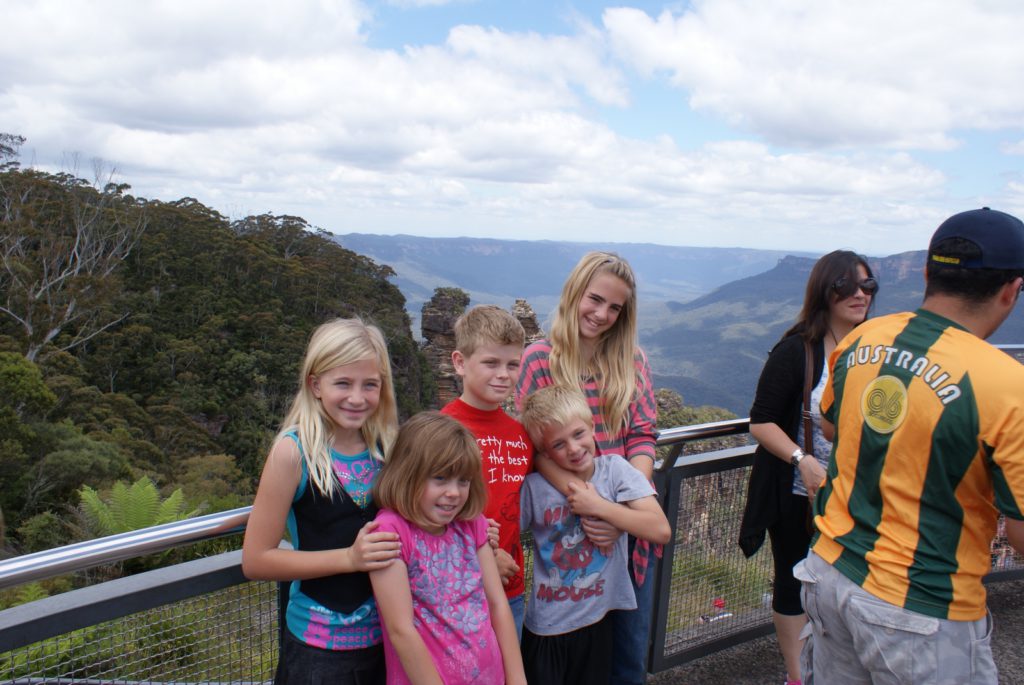On the way to a Harry Potter exhibition, the cousins tempted fate by hopping across the water feature. Carrie took an unplanned dip a few seconds later.This sea lion greeted us at Taronga Zoo.The lazy red kangaroo.Chris and Zack by an uncharacteristically pleasant Tasmanian devil.All the cousins in front of the seldom seen platypus.Zack finds a hand print just his size.We met three young koalas named River, Ash and Rubi.These giraffes have a great view of the Sydney skyline across the harbor.After the zoo we made a quick visit to the Opera House.The cousins are dwarfed by the sail of the larger hall.We walked across the Harbour Bridge for the first time. This afforded a different perspective of the harbor.Nearly halfway across the Harbour Bridge we had a really nice view of the Opera House and Circular Quay.Across the bridge was Luna Park, a boardwalk-style amusement park.The cousins started on this wild pirate ship.The carousel was a favorite ride.The girls enjoyed waving to their subjects.The Ferris wheel was another favorite ride.A view from atop the ferris wheel.Chris and Carrie talked Dave into this torture chamber. It looks like Carrie enjoyed the ride.Chris and Carol get tossed about.Another view of the Opera House on the ferry ride back to the hotel.Steve and Susie in front of the Blue Mountains.The three sisters, five cousins and two strangers.