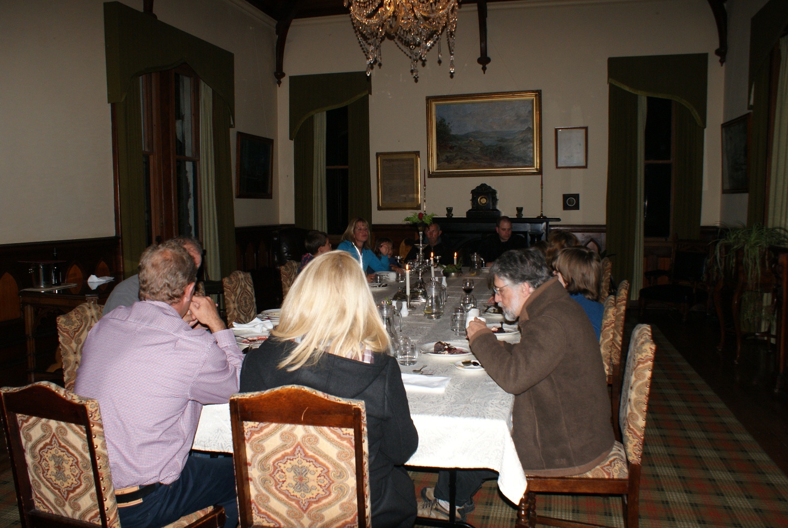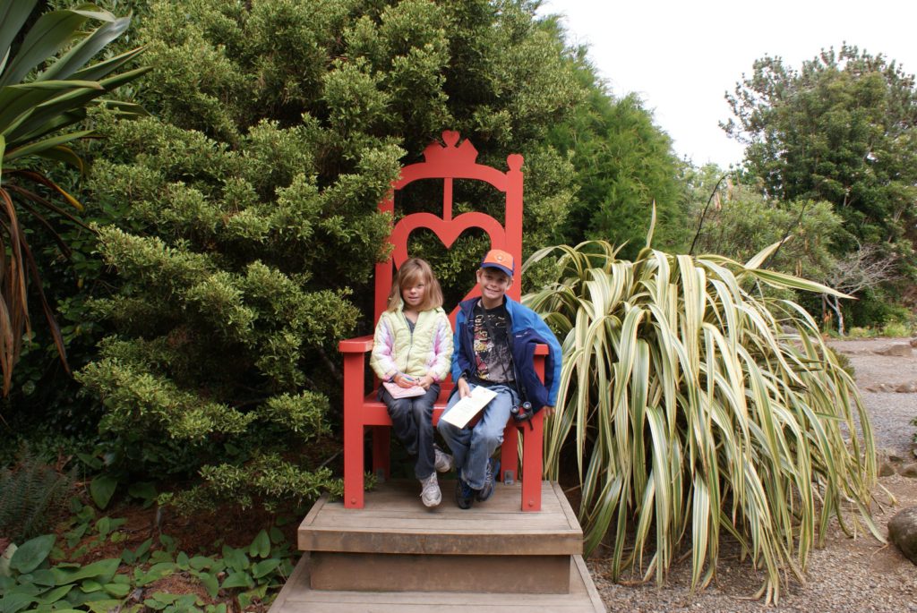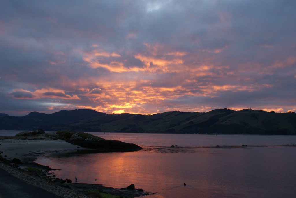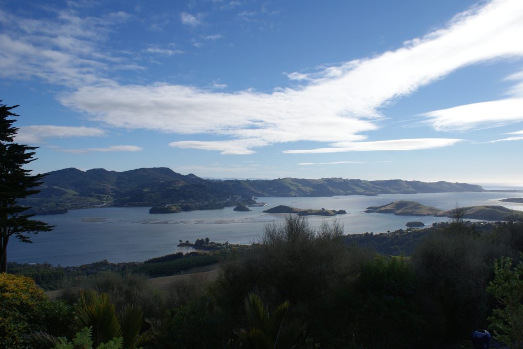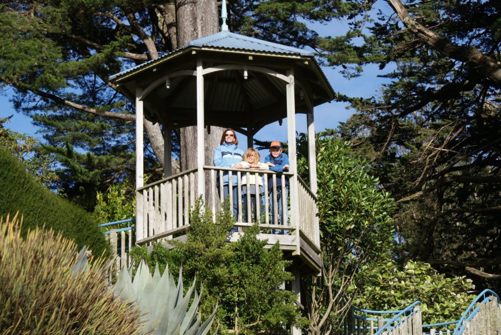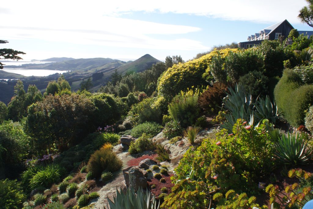 Sunrise from our room at Larnach Lodge.Our first daylight look at the Larnach Castle before we toured the grounds. The estate is divided into several themed gardens.Carol under the pergola. It was a bit colder today, thus the warmer jackets.Carrie by the reflecting pool.All of us on top of the castle roof.The view to the northeast, over the South Seas garden.The view to the north from the same spot.The 3 Cs take in the view from the South Seas Belvedere.A final view of the South Seas garden, including a glimpse of the Larnach Lodge in the upper right corner.On our way to lunch we found this dog blocking the door to the cafe. It turned out to be Fern, the family dog of the Castle’s current owners.We spotted this butterfly in the main flower garden.This was also in the main flower garden.Chris and Carrie were happy to try out the throne at the entrance to the Temperate Rainforest garden.The Lost Rock Garden had many interesting and pretty flowers including this one……and these……and these.These lone flowers were in a section called the Field.Chris and Carrie played ring around the rosy in the Field. This is just before the happy play turned to out of control (as it inevitability does).This was the last flower we photographed. Its petals were white from above……but had purple highlights underneath.Late in the afternoon we went to a Yellow Eyed Penguin conservation reserve. We went on a 90 minute walking tour where we got to watch these endangered penguins emerge from ocean and return to their nests for the night. There is actually a penguin hidden in the cover of the bushy growth just to the left of center.Three seals came ashore to rest while we were walking down to the nesting areas.This little guy hasn’t quite finished molting and has been living off his fat stores fore about three to four weeks. Only when his new feathers are ready will he head back to the ocean to feed.This one has just returned from the ocean and is walking to his nest.On the way back to Larnach Lodge we watched the sun set across Otago Harbour.After the penguin reserve, we returned to the castle for a formal dinner. The music room was transformed to accommodate many of the guests staying at the lodge.These two deserts are a great way to end the day at Larnach Castle!