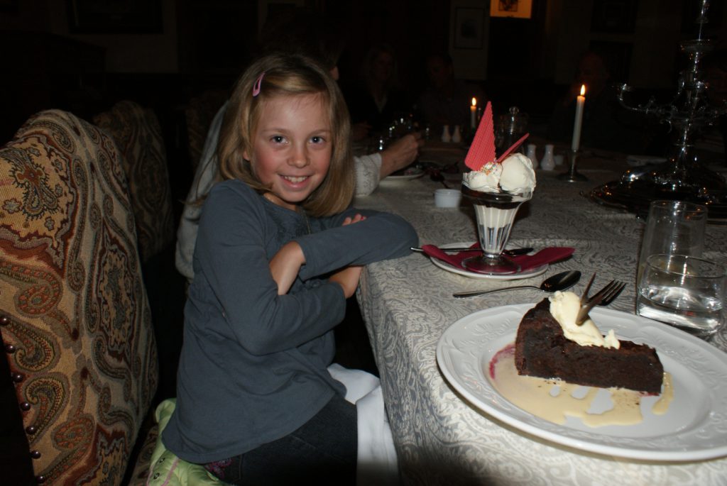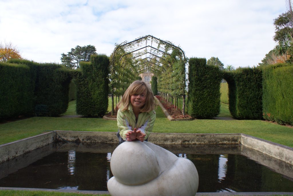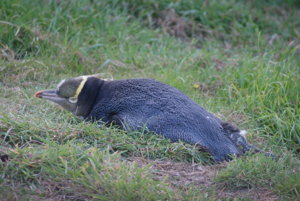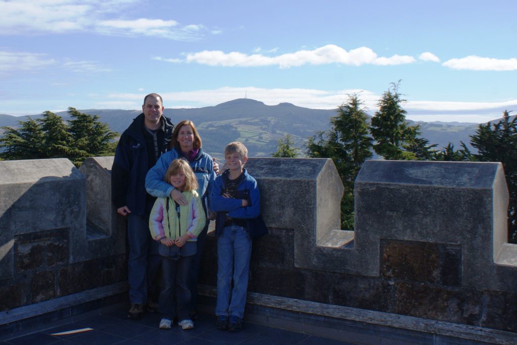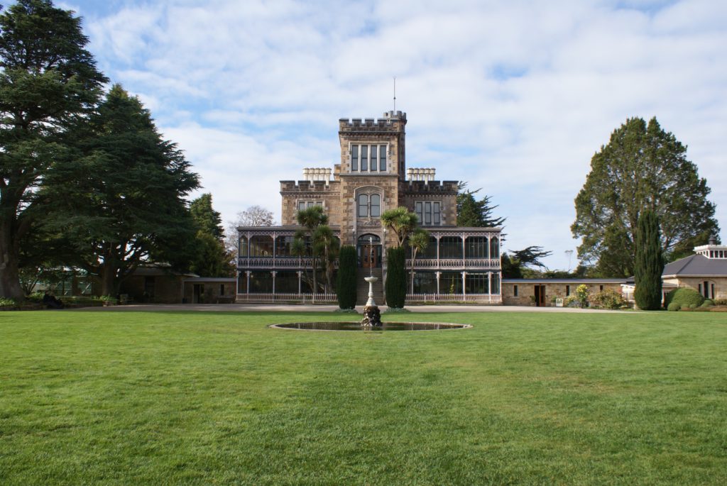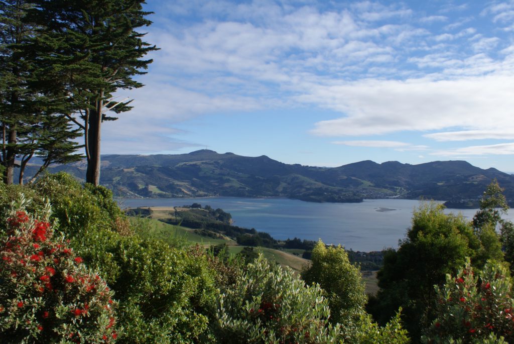 Sunrise from our room at Larnach Lodge.Our first daylight look at the Larnach Castle before we toured the grounds. The estate is divided into several themed gardens.Carol under the pergola. It was a bit colder today, thus the warmer jackets.Carrie by the reflecting pool.All of us on top of the castle roof.The view to the northeast, over the South Seas garden.The view to the north from the same spot.The 3 Cs take in the view from the South Seas Belvedere.A final view of the South Seas garden, including a glimpse of the Larnach Lodge in the upper right corner.On our way to lunch we found this dog blocking the door to the cafe. It turned out to be Fern, the family dog of the Castle’s current owners.We spotted this butterfly in the main flower garden.This was also in the main flower garden.Chris and Carrie were happy to try out the throne at the entrance to the Temperate Rainforest garden.The Lost Rock Garden had many interesting and pretty flowers including this one……and these……and these.These lone flowers were in a section called the Field.Chris and Carrie played ring around the rosy in the Field. This is just before the happy play turned to out of control (as it inevitability does).This was the last flower we photographed. Its petals were white from above……but had purple highlights underneath.Late in the afternoon we went to a Yellow Eyed Penguin conservation reserve. We went on a 90 minute walking tour where we got to watch these endangered penguins emerge from ocean and return to their nests for the night. There is actually a penguin hidden in the cover of the bushy growth just to the left of center.Three seals came ashore to rest while we were walking down to the nesting areas.This little guy hasn’t quite finished molting and has been living off his fat stores fore about three to four weeks. Only when his new feathers are ready will he head back to the ocean to feed.This one has just returned from the ocean and is walking to his nest.On the way back to Larnach Lodge we watched the sun set across Otago Harbour.After the penguin reserve, we returned to the castle for a formal dinner. The music room was transformed to accommodate many of the guests staying at the lodge.These two deserts are a great way to end the day at Larnach Castle!