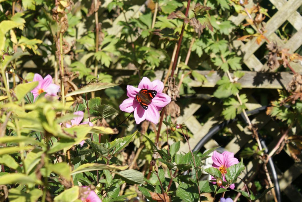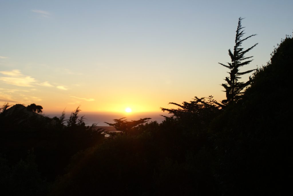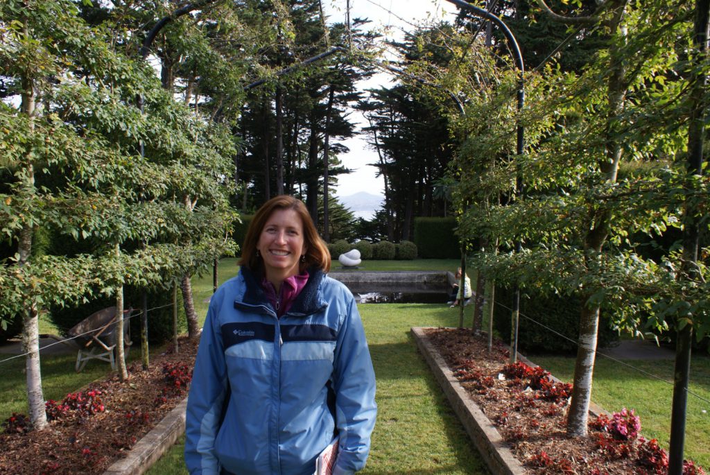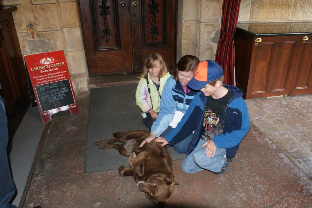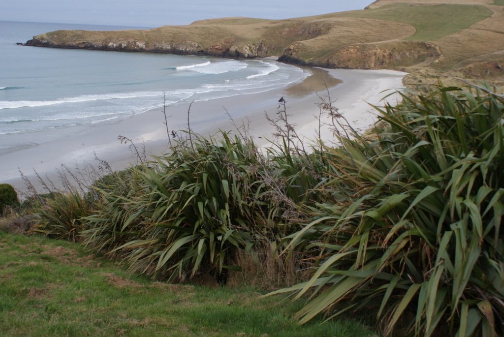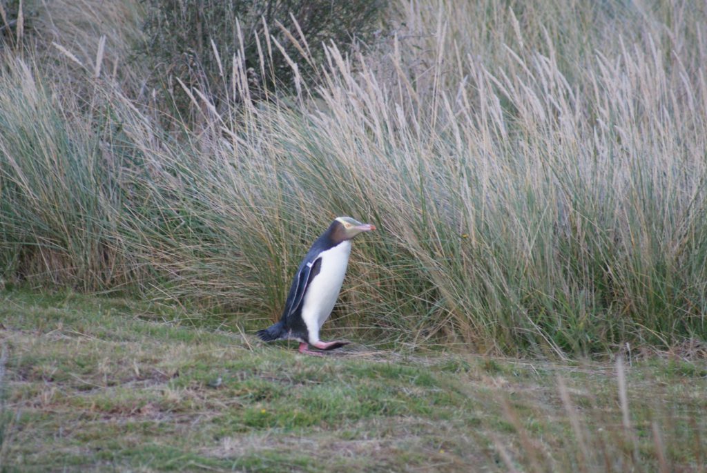 Sunrise from our room at Larnach Lodge.Our first daylight look at the Larnach Castle before we toured the grounds. The estate is divided into several themed gardens.Carol under the pergola. It was a bit colder today, thus the warmer jackets.Carrie by the reflecting pool.All of us on top of the castle roof.The view to the northeast, over the South Seas garden.The view to the north from the same spot.The 3 Cs take in the view from the South Seas Belvedere.A final view of the South Seas garden, including a glimpse of the Larnach Lodge in the upper right corner.On our way to lunch we found this dog blocking the door to the cafe. It turned out to be Fern, the family dog of the Castle’s current owners.We spotted this butterfly in the main flower garden.This was also in the main flower garden.Chris and Carrie were happy to try out the throne at the entrance to the Temperate Rainforest garden.The Lost Rock Garden had many interesting and pretty flowers including this one……and these……and these.These lone flowers were in a section called the Field.Chris and Carrie played ring around the rosy in the Field. This is just before the happy play turned to out of control (as it inevitability does).This was the last flower we photographed. Its petals were white from above……but had purple highlights underneath.Late in the afternoon we went to a Yellow Eyed Penguin conservation reserve. We went on a 90 minute walking tour where we got to watch these endangered penguins emerge from ocean and return to their nests for the night. There is actually a penguin hidden in the cover of the bushy growth just to the left of center.Three seals came ashore to rest while we were walking down to the nesting areas.This little guy hasn’t quite finished molting and has been living off his fat stores fore about three to four weeks. Only when his new feathers are ready will he head back to the ocean to feed.This one has just returned from the ocean and is walking to his nest.On the way back to Larnach Lodge we watched the sun set across Otago Harbour.After the penguin reserve, we returned to the castle for a formal dinner. The music room was transformed to accommodate many of the guests staying at the lodge.These two deserts are a great way to end the day at Larnach Castle!