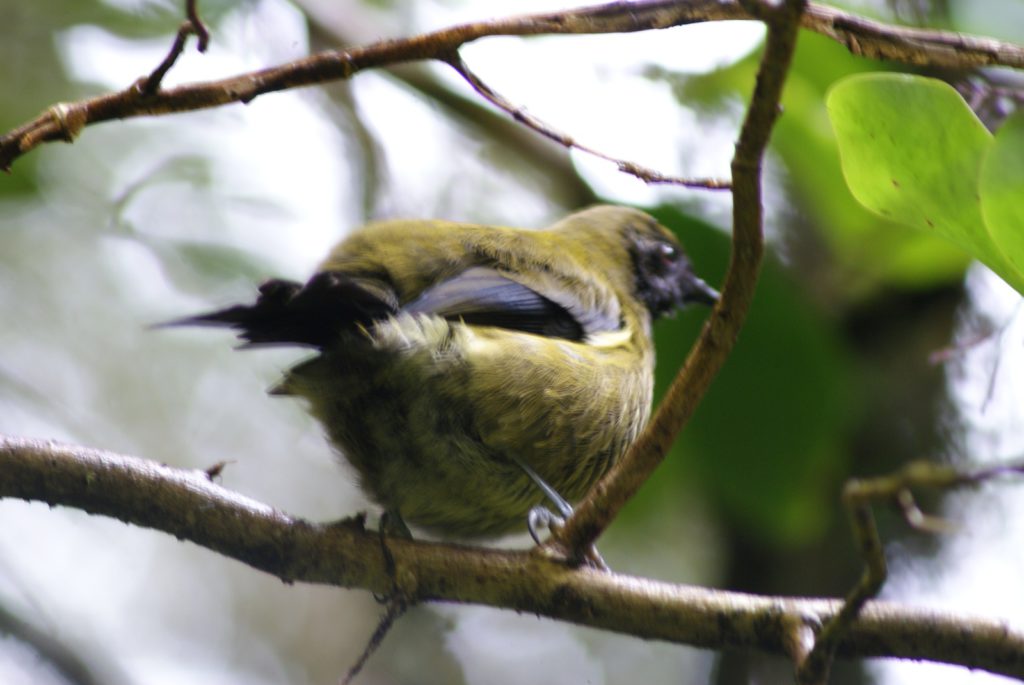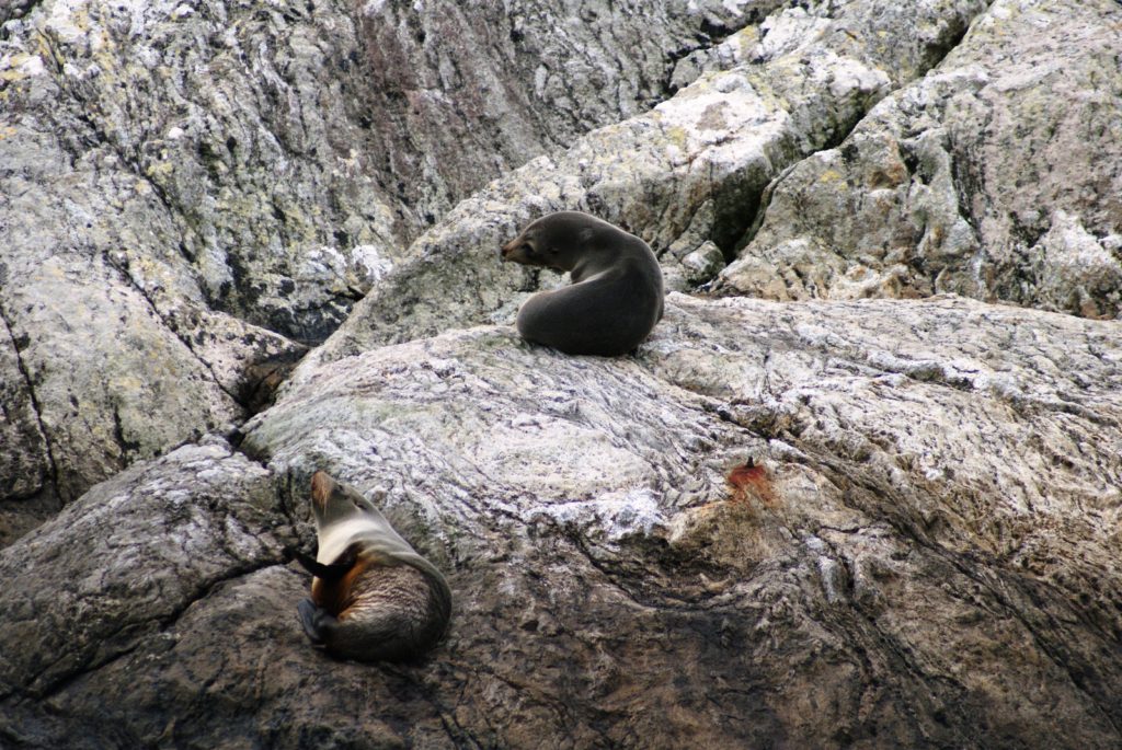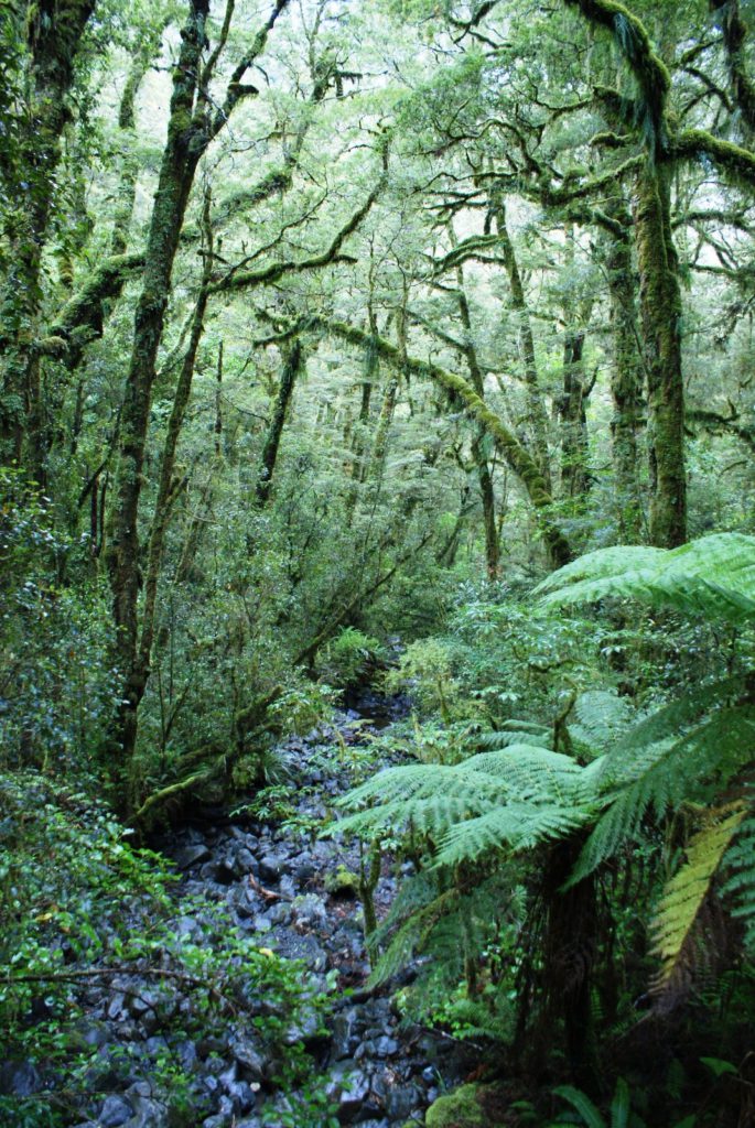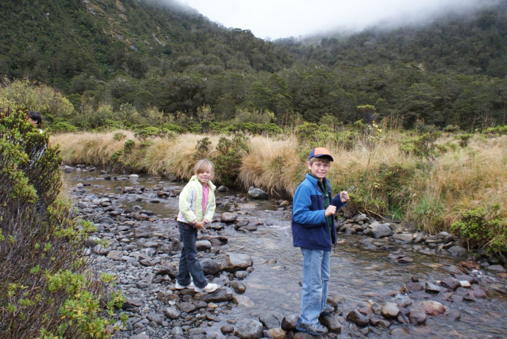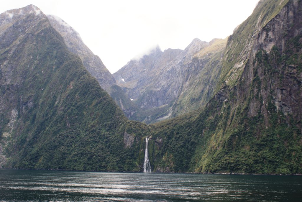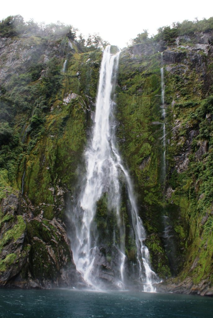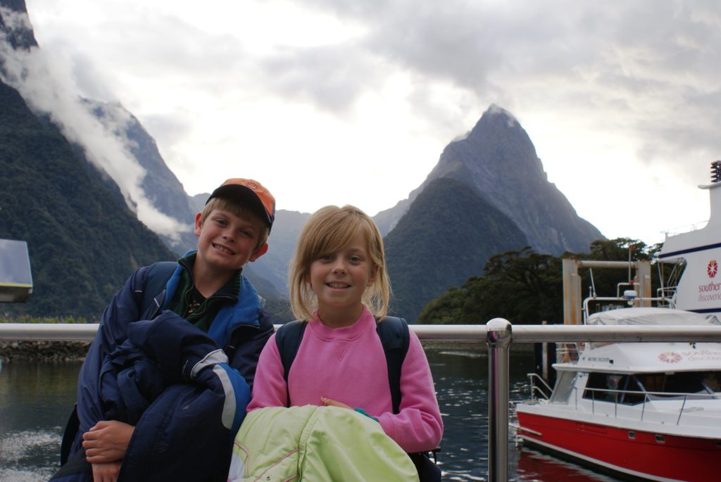 On the drive to Milford Sound we stopped at a fresh water stream and filled up our water bottles.A Kea, one of New Zealand’s parrots, perches in a mountain tree. Although this picture shows how well it blends with its surrounds, when they fly you can see bright orange under its wings.We took a ten minute walk into the forest and were amazed how many shades of green we saw.We also heard and spotted this New Zealand Bellbird on the walk.Finally, after five and a half hours, we arrived at Milford Sound and boarded this boat, the Milford Mariner.Our first clear view of Milford Sound.There were many waterfalls along the way.Here’s a closer look at the same falls. The captain would maneuver the bow of the boat within a few feet of the base of the waterfalls.This is a view of the New Zealand coastline to the north of Milford Sound. We only spent a few minutes in the open waters of the Tasman Sea. Of note, at this latitude, if we sailed due east we wouldn’t reach land again until Argentina.Milford Sound was the last of fifteen fiords in New Zealand to be found by the European explorers because its opening is hard to see from the ocean, as this picture shows.Just inside the inlet we spotted some fur seals resting on a rock.None of our pictures captured the grandeur and scale of the mountains and the waterfalls.Here is another shot with some boats in the foreground to try and lend some perspective.We neglected to get any pictures of the kids on the boat. This is the best we could manage once we got ashore.