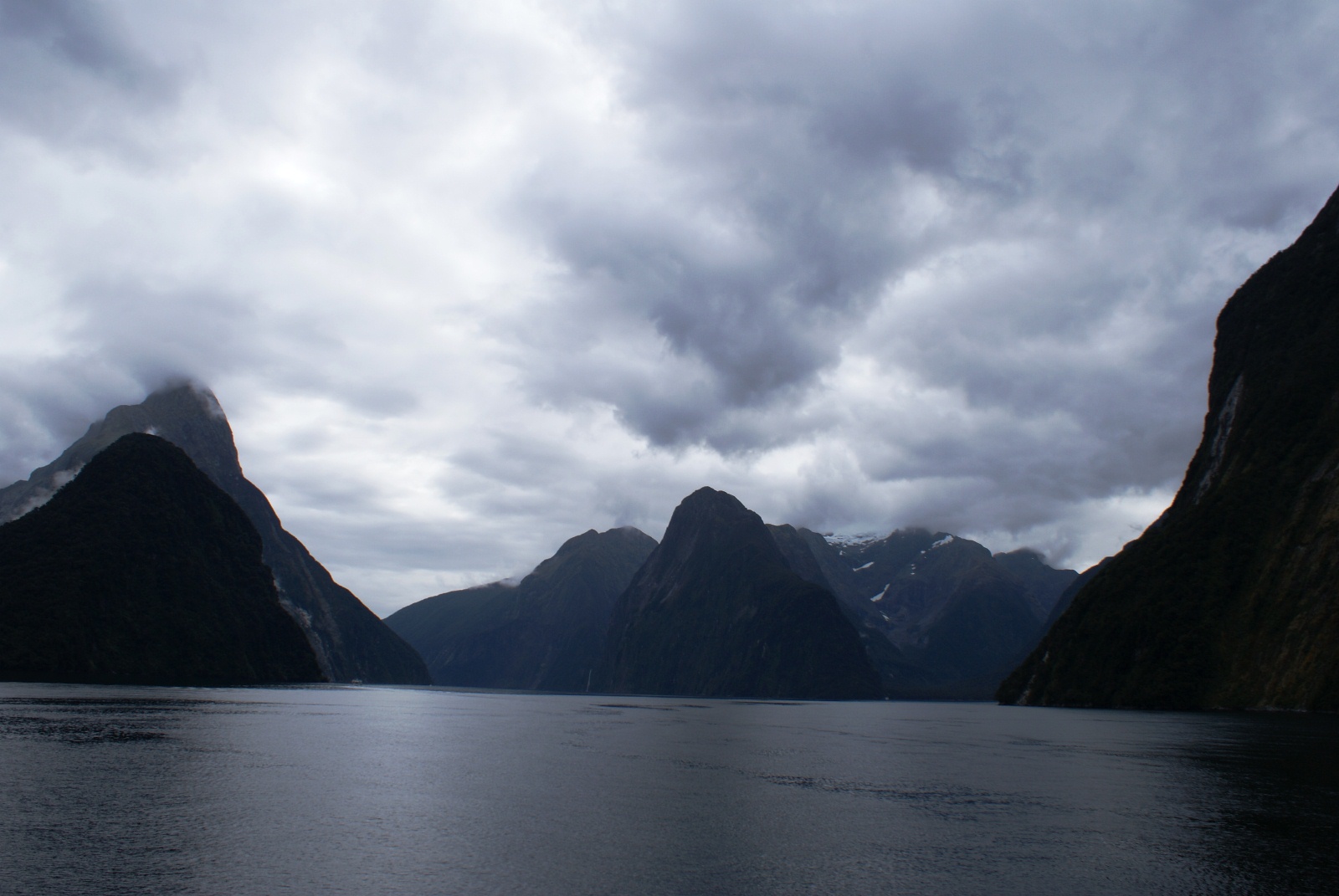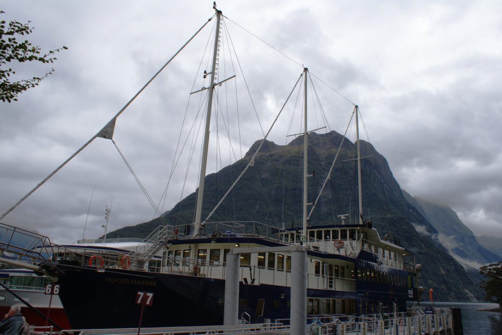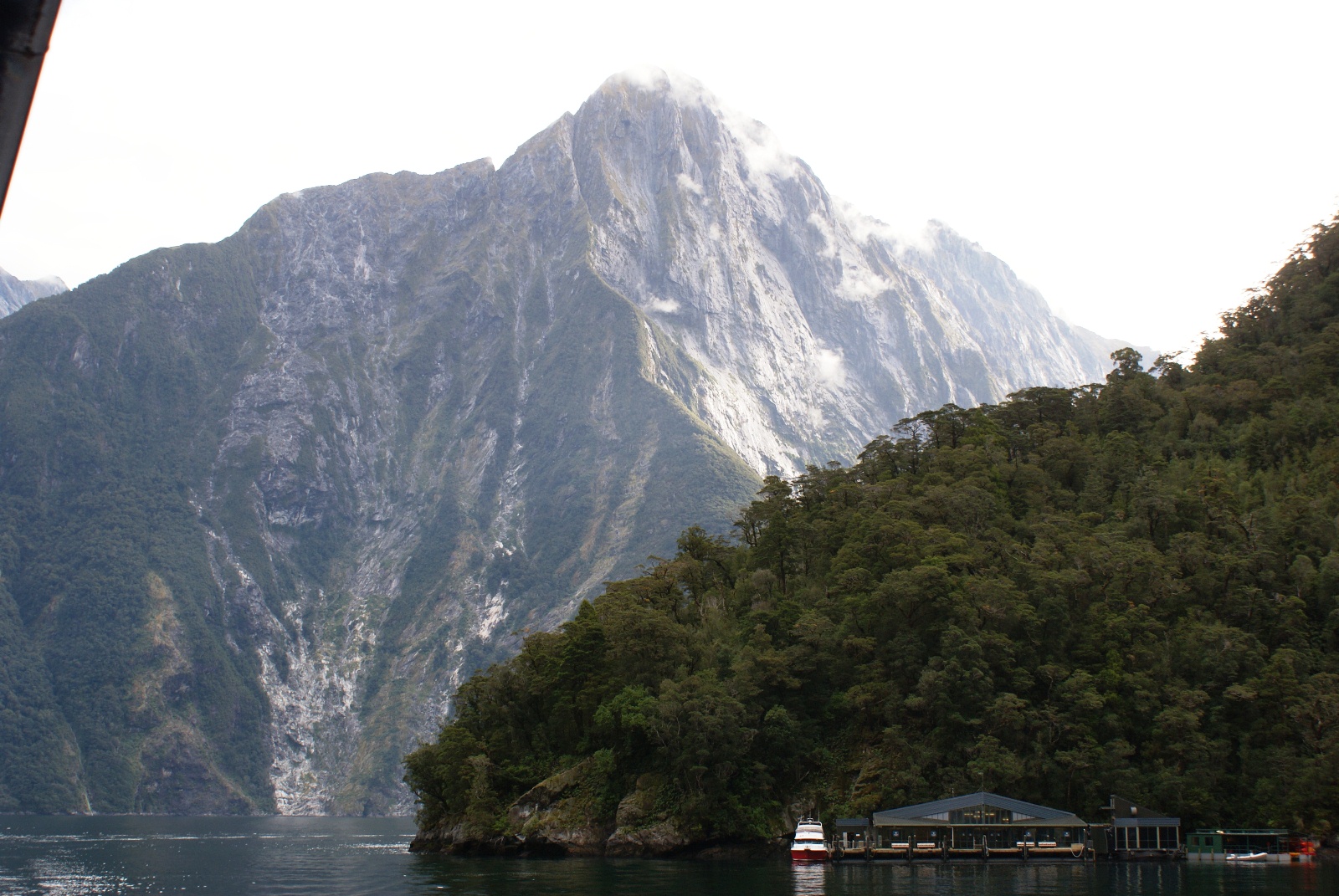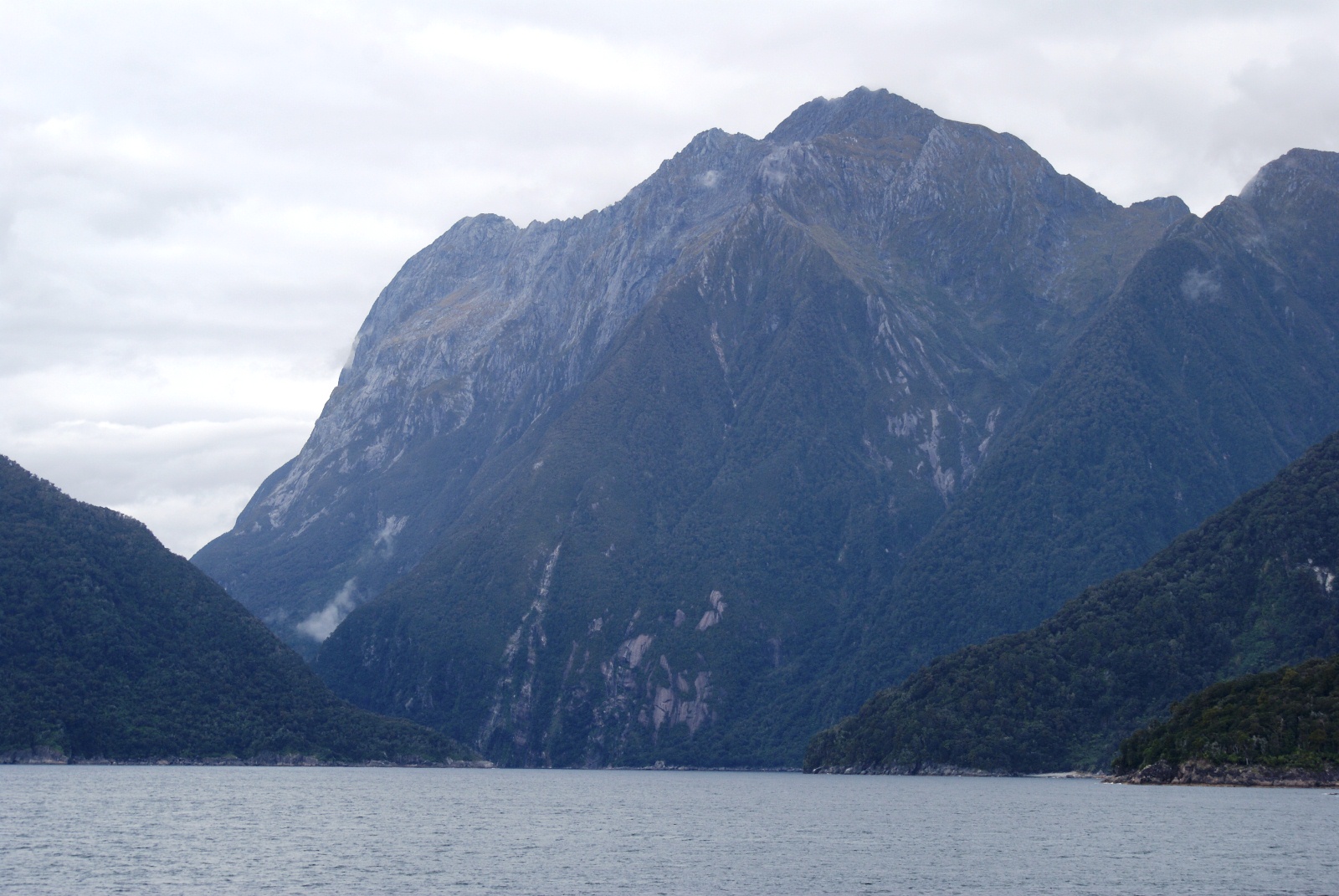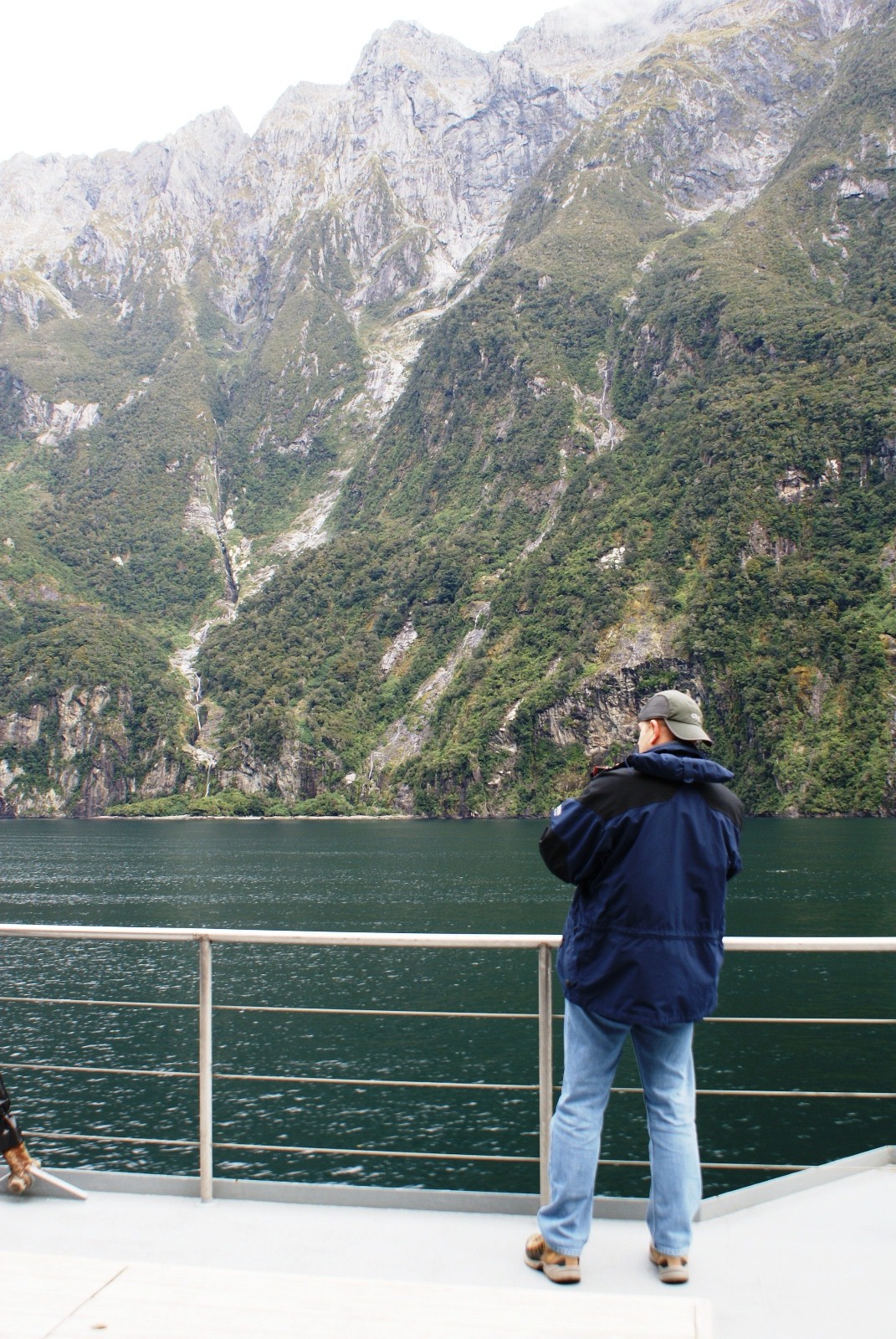Today was our big trip from Queenstown to Milford Sound for a nature cruise. Milford Sound is actually a fiord (as it is spelled in New Zealand), not a sound. We took a tour bus to and from Milford Sound and were entertained and educated by our driver. He is Maori and had much to tell us about what we saw along the way as well as some Maori history and legends that related to them. We were on the cruise for about two and a half hours, just long enough to sail the length of the fiord, turn around in the Tasman Sea, and come back to port. The day was overcast but it didn’t rain on us. Here are some of today’s photos.