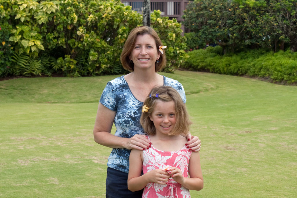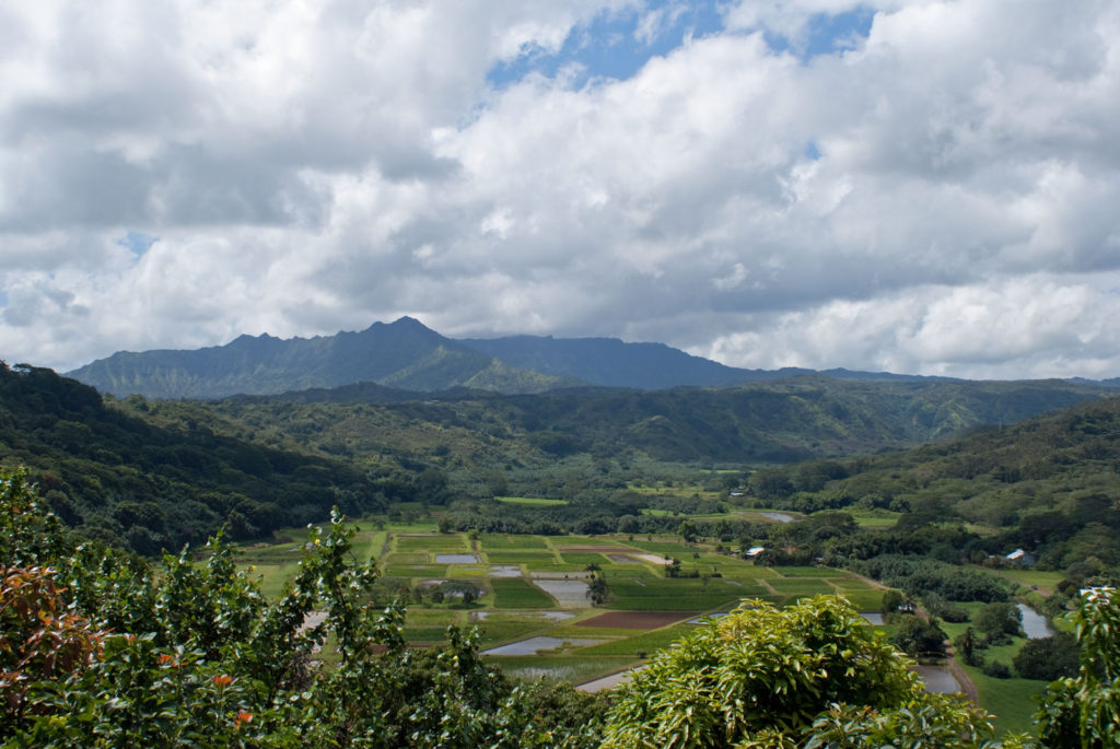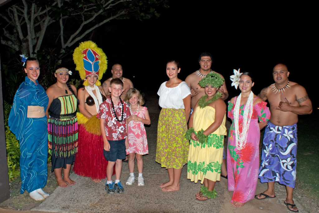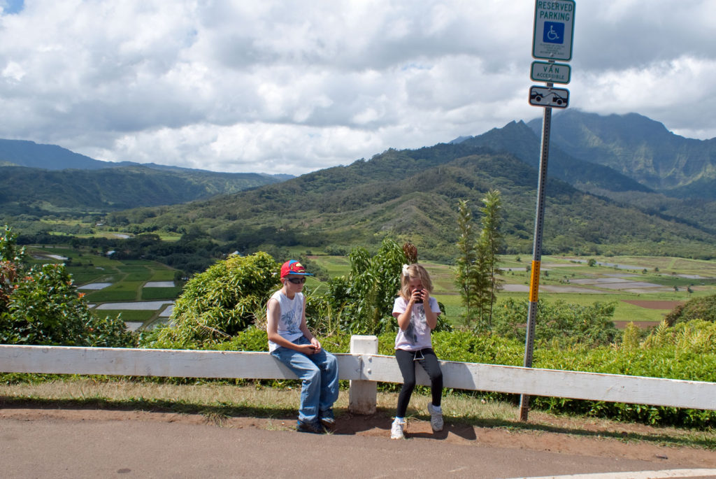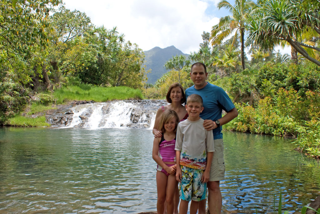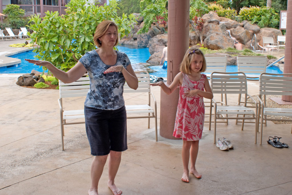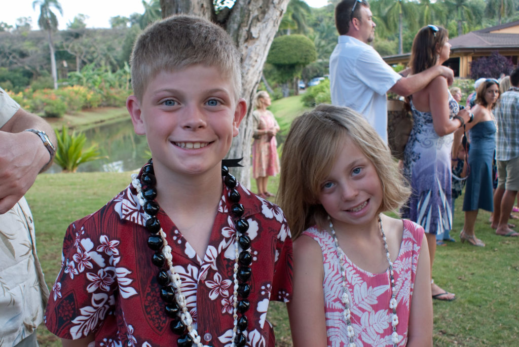 Just west of Princeville was Hanalei Bay, shown here in the distance. We went to the beach there a couple of times. Chris and Carrie test the waters at Hanalei Bay.Carrie had a blast on her boogie board.Whee!Chris enjoyed his boogie board too, although he wasn’t quite as fearless as Carrie.Chris spent most of his time at the beach building sand castles.Evidently sand castles take a lot of concentration……and occasionally the help an engineer.Our resort offered a variety of activities, including tennis lessons. Here Carrie shows off her backhand.See the ball…be the ball…you are the ball.While the kids were playing tennis, Dave and Carol relaxed in the shade of a banyan tree.Another resort activity was hula lessons.The dancers after their lesson.While the girls were learning to hula, Dave and Chris went on a walk around Princeville. Here are mountains to the west.And here is the coast and ocean to the east.As we walked we came across a plant Dave remembered from his childhood on Oahu. Commonly called sensitive plant or touch-me-not, it is shown above with the pink flowers and dark green leaves. When you touch the leaves, they fold inward toward the stalk for a few minutes.Here is a blooming Red Ginger flower.And here is a Red Tower Ginger.And the iconic Plumeria.One bit of trivia is that Kauai is infested with thousands of wild chickens. Some people call them “jungle fowl”, which has a slightly more distinguished sound to it. Unfortunately the males tend to crow all day long, not just in the morning.Red-crested Cardinals are also very common on the island.We also sighted the official state bird of Hawaii, the Nene or walking by. The Nene evolved from the Canada Goose and is now the rarest goose with less than 1000 birds in the wild.One evening we went to the Smith Family Garden Luau. Here Kamika Smith tells the guests how the pig (in the dirt-covered pit at his feet) was prepared.Chris and Carrie dressed for the occasion.Peacocks roamed the gardens around the luau. We finally realized the sound made by Kevin the snipe in the move Up is the call of a peafowl.Just before we ate, Chris wandered over to a small lake by the gardens.The meal included Purple Sweet Potatoes…there just isn’t enough blue food!During the meal some of the braver guests got on stage and danced. Carrie was able to show off the moves she learned in fer hula lesson.After the luau, we watched a show featuring traditional dances from Hawaii, Tahiti, Samoa, Philippines, New Zealand, China and Japan. It was too dark to get good pictures of the show, but some of the performers posed for a picture with Chris and Carrie afterwards.Our last big activity was a horseback ride through Silver Falls Ranch. This picture was taken just after Carol got on her horse and is the last time she was seen smiling till she dismounted. Her horse was a bit naughty and kept taking the road less traveled.Here we go toward the Kamookoa Ridge.Carrie seemed to ride like a pro.After about an hour we stopped by a small pool for a break and lunch.Chris didn’t need much prompting to jump in.Carrie, on the other hand, needed to see Chris do it a couple of times before she took a turn.Splash!We couldn’t leave Hawaii without a picture of a Hibiscus.Lunch was a simple pork and rice meal, but very tasty.The lunchtime view was pretty good too.On the way out we passed some pretty purple flowers that contrasted with the red earth and green trees.Happy Chris.On our last day we took this picture of the taro fields and distant mountains.While Dave and Carol were enjoying the view, Chris and Carrie were in their own little world.