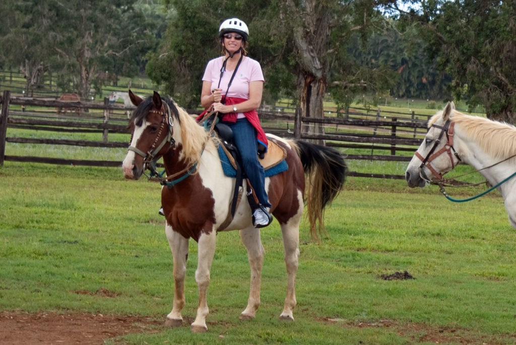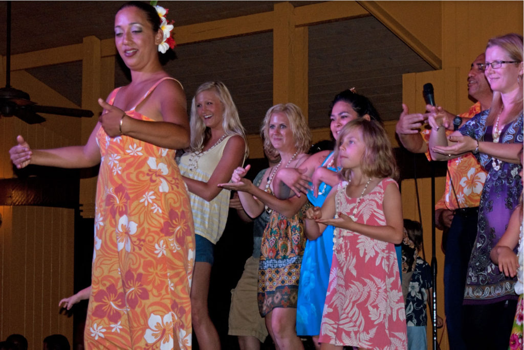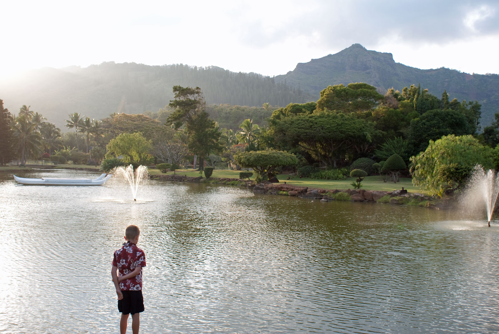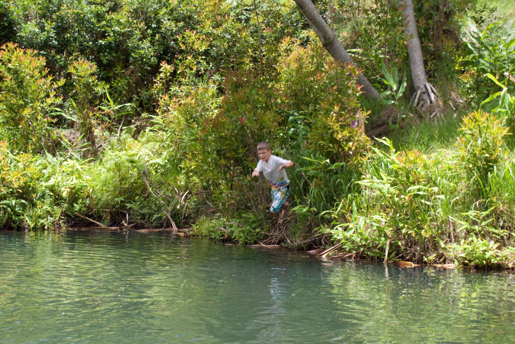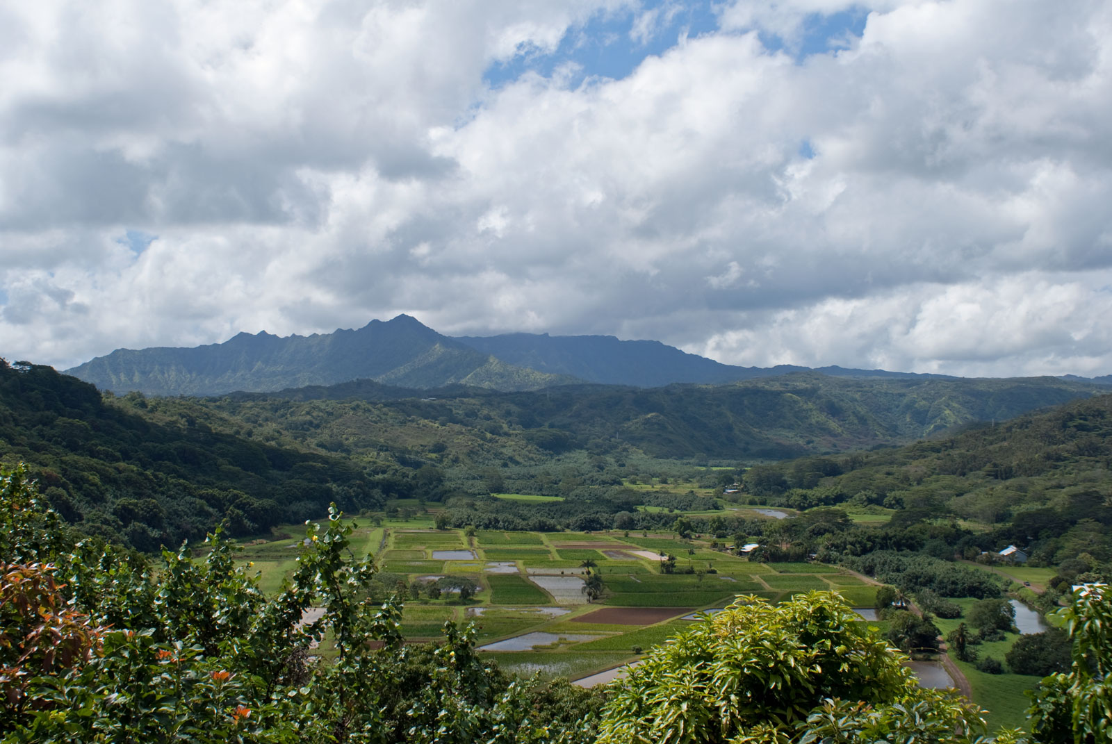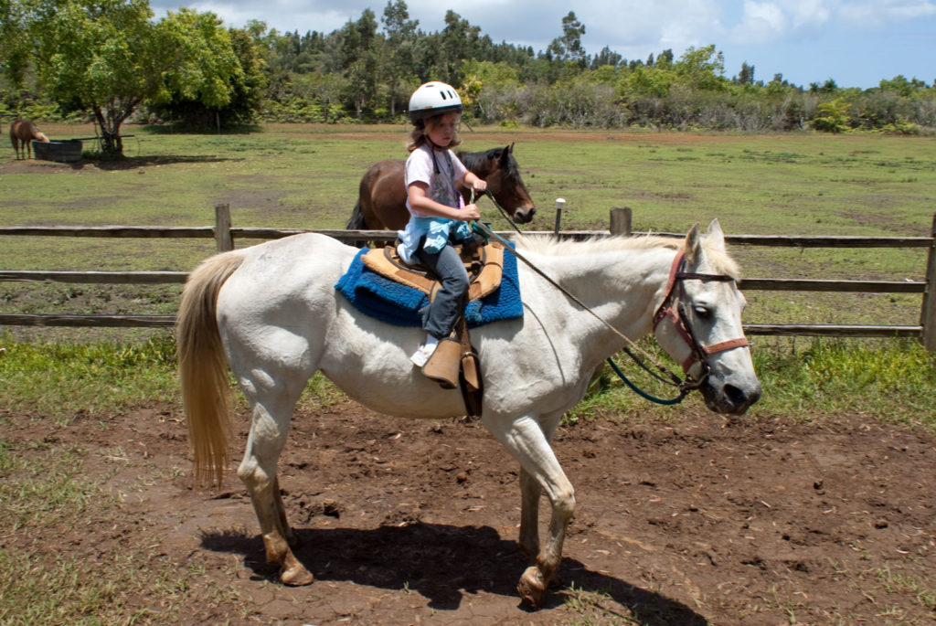 Just west of Princeville was Hanalei Bay, shown here in the distance. We went to the beach there a couple of times. Chris and Carrie test the waters at Hanalei Bay.Carrie had a blast on her boogie board.Whee!Chris enjoyed his boogie board too, although he wasn’t quite as fearless as Carrie.Chris spent most of his time at the beach building sand castles.Evidently sand castles take a lot of concentration……and occasionally the help an engineer.Our resort offered a variety of activities, including tennis lessons. Here Carrie shows off her backhand.See the ball…be the ball…you are the ball.While the kids were playing tennis, Dave and Carol relaxed in the shade of a banyan tree.Another resort activity was hula lessons.The dancers after their lesson.While the girls were learning to hula, Dave and Chris went on a walk around Princeville. Here are mountains to the west.And here is the coast and ocean to the east.As we walked we came across a plant Dave remembered from his childhood on Oahu. Commonly called sensitive plant or touch-me-not, it is shown above with the pink flowers and dark green leaves. When you touch the leaves, they fold inward toward the stalk for a few minutes.Here is a blooming Red Ginger flower.And here is a Red Tower Ginger.And the iconic Plumeria.One bit of trivia is that Kauai is infested with thousands of wild chickens. Some people call them “jungle fowl”, which has a slightly more distinguished sound to it. Unfortunately the males tend to crow all day long, not just in the morning.Red-crested Cardinals are also very common on the island.We also sighted the official state bird of Hawaii, the Nene or walking by. The Nene evolved from the Canada Goose and is now the rarest goose with less than 1000 birds in the wild.One evening we went to the Smith Family Garden Luau. Here Kamika Smith tells the guests how the pig (in the dirt-covered pit at his feet) was prepared.Chris and Carrie dressed for the occasion.Peacocks roamed the gardens around the luau. We finally realized the sound made by Kevin the snipe in the move Up is the call of a peafowl.Just before we ate, Chris wandered over to a small lake by the gardens.The meal included Purple Sweet Potatoes…there just isn’t enough blue food!During the meal some of the braver guests got on stage and danced. Carrie was able to show off the moves she learned in fer hula lesson.After the luau, we watched a show featuring traditional dances from Hawaii, Tahiti, Samoa, Philippines, New Zealand, China and Japan. It was too dark to get good pictures of the show, but some of the performers posed for a picture with Chris and Carrie afterwards.Our last big activity was a horseback ride through Silver Falls Ranch. This picture was taken just after Carol got on her horse and is the last time she was seen smiling till she dismounted. Her horse was a bit naughty and kept taking the road less traveled.Here we go toward the Kamookoa Ridge.Carrie seemed to ride like a pro.After about an hour we stopped by a small pool for a break and lunch.Chris didn’t need much prompting to jump in.Carrie, on the other hand, needed to see Chris do it a couple of times before she took a turn.Splash!We couldn’t leave Hawaii without a picture of a Hibiscus.Lunch was a simple pork and rice meal, but very tasty.The lunchtime view was pretty good too.On the way out we passed some pretty purple flowers that contrasted with the red earth and green trees.Happy Chris.On our last day we took this picture of the taro fields and distant mountains.While Dave and Carol were enjoying the view, Chris and Carrie were in their own little world.