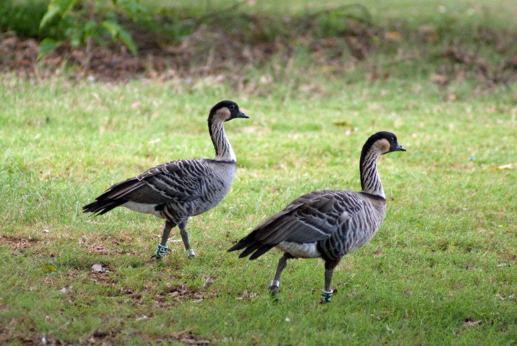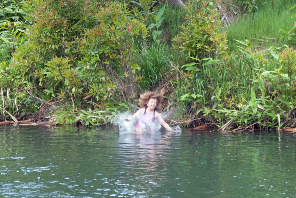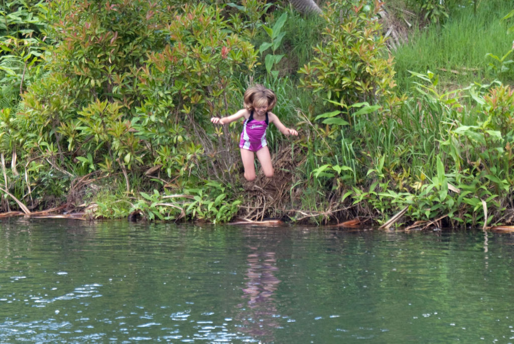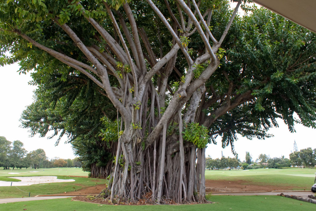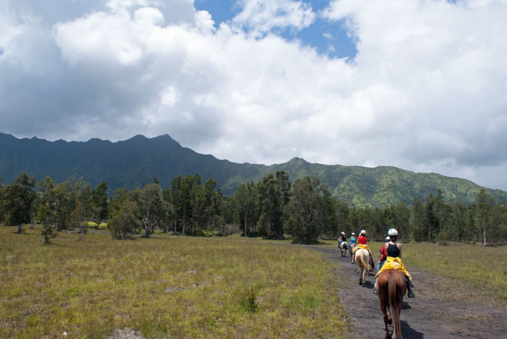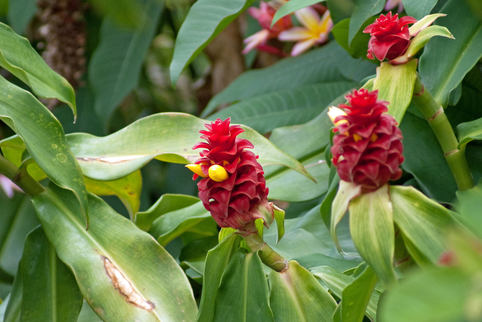 Just west of Princeville was Hanalei Bay, shown here in the distance. We went to the beach there a couple of times. Chris and Carrie test the waters at Hanalei Bay.Carrie had a blast on her boogie board.Whee!Chris enjoyed his boogie board too, although he wasn’t quite as fearless as Carrie.Chris spent most of his time at the beach building sand castles.Evidently sand castles take a lot of concentration……and occasionally the help an engineer.Our resort offered a variety of activities, including tennis lessons. Here Carrie shows off her backhand.See the ball…be the ball…you are the ball.While the kids were playing tennis, Dave and Carol relaxed in the shade of a banyan tree.Another resort activity was hula lessons.The dancers after their lesson.While the girls were learning to hula, Dave and Chris went on a walk around Princeville. Here are mountains to the west.And here is the coast and ocean to the east.As we walked we came across a plant Dave remembered from his childhood on Oahu. Commonly called sensitive plant or touch-me-not, it is shown above with the pink flowers and dark green leaves. When you touch the leaves, they fold inward toward the stalk for a few minutes.Here is a blooming Red Ginger flower.And here is a Red Tower Ginger.And the iconic Plumeria.One bit of trivia is that Kauai is infested with thousands of wild chickens. Some people call them “jungle fowl”, which has a slightly more distinguished sound to it. Unfortunately the males tend to crow all day long, not just in the morning.Red-crested Cardinals are also very common on the island.We also sighted the official state bird of Hawaii, the Nene or walking by. The Nene evolved from the Canada Goose and is now the rarest goose with less than 1000 birds in the wild.One evening we went to the Smith Family Garden Luau. Here Kamika Smith tells the guests how the pig (in the dirt-covered pit at his feet) was prepared.Chris and Carrie dressed for the occasion.Peacocks roamed the gardens around the luau. We finally realized the sound made by Kevin the snipe in the move Up is the call of a peafowl.Just before we ate, Chris wandered over to a small lake by the gardens.The meal included Purple Sweet Potatoes…there just isn’t enough blue food!During the meal some of the braver guests got on stage and danced. Carrie was able to show off the moves she learned in fer hula lesson.After the luau, we watched a show featuring traditional dances from Hawaii, Tahiti, Samoa, Philippines, New Zealand, China and Japan. It was too dark to get good pictures of the show, but some of the performers posed for a picture with Chris and Carrie afterwards.Our last big activity was a horseback ride through Silver Falls Ranch. This picture was taken just after Carol got on her horse and is the last time she was seen smiling till she dismounted. Her horse was a bit naughty and kept taking the road less traveled.Here we go toward the Kamookoa Ridge.Carrie seemed to ride like a pro.After about an hour we stopped by a small pool for a break and lunch.Chris didn’t need much prompting to jump in.Carrie, on the other hand, needed to see Chris do it a couple of times before she took a turn.Splash!We couldn’t leave Hawaii without a picture of a Hibiscus.Lunch was a simple pork and rice meal, but very tasty.The lunchtime view was pretty good too.On the way out we passed some pretty purple flowers that contrasted with the red earth and green trees.Happy Chris.On our last day we took this picture of the taro fields and distant mountains.While Dave and Carol were enjoying the view, Chris and Carrie were in their own little world.
