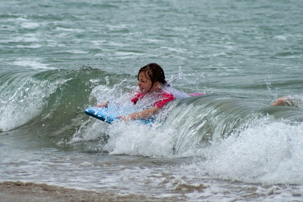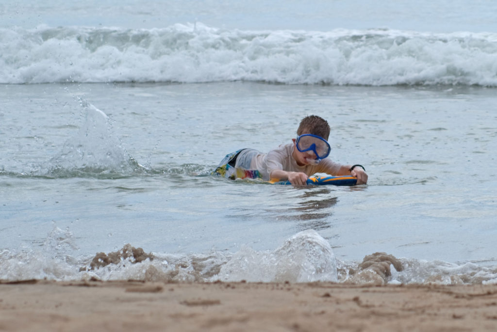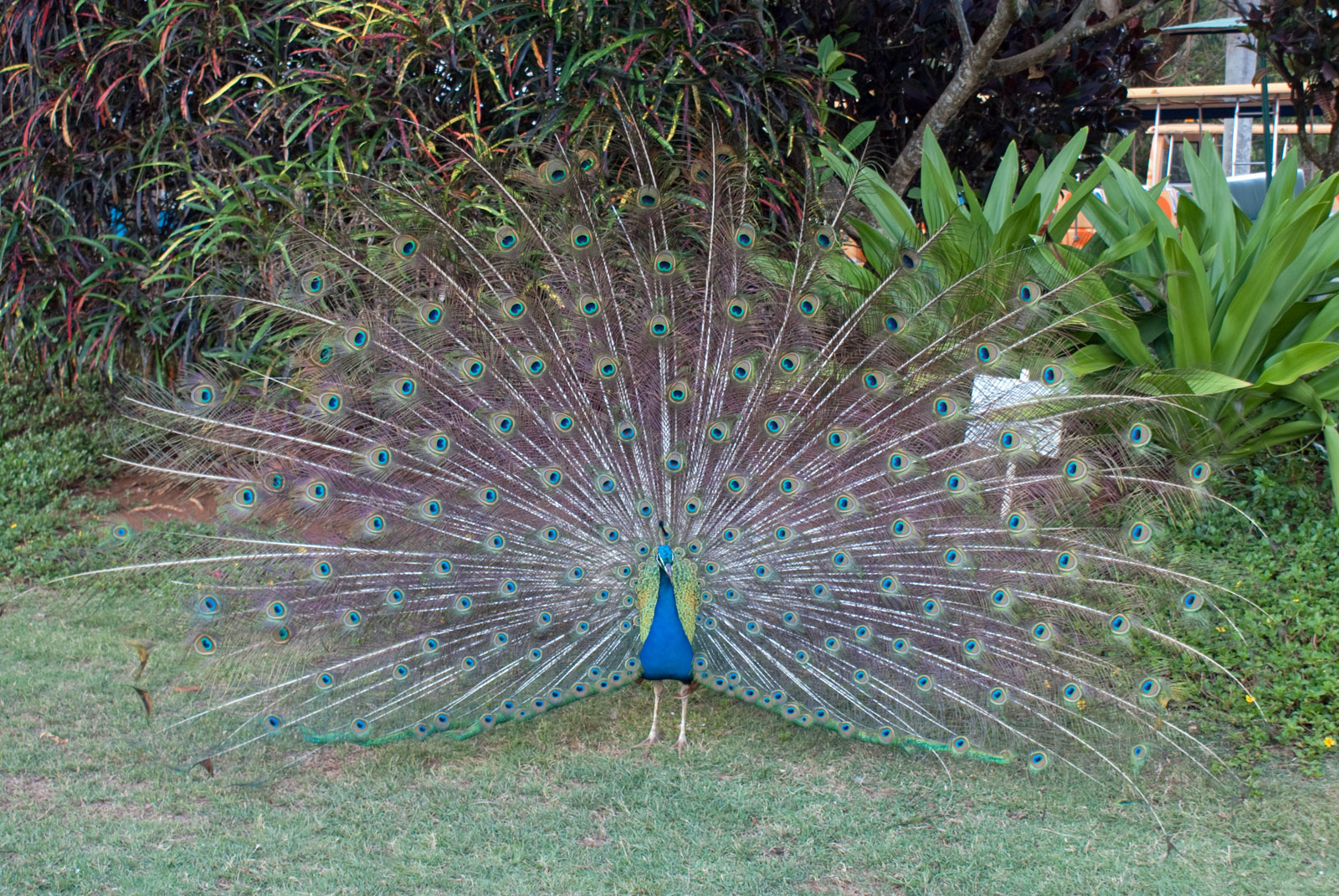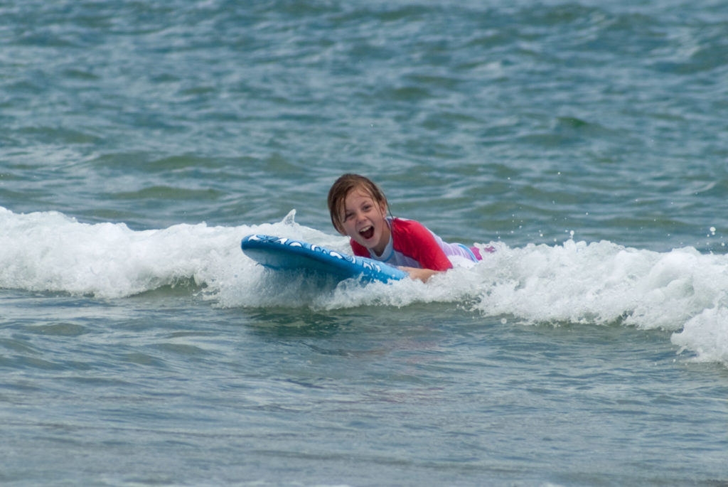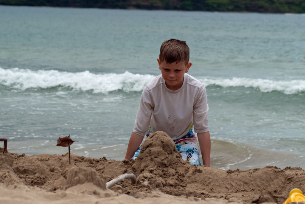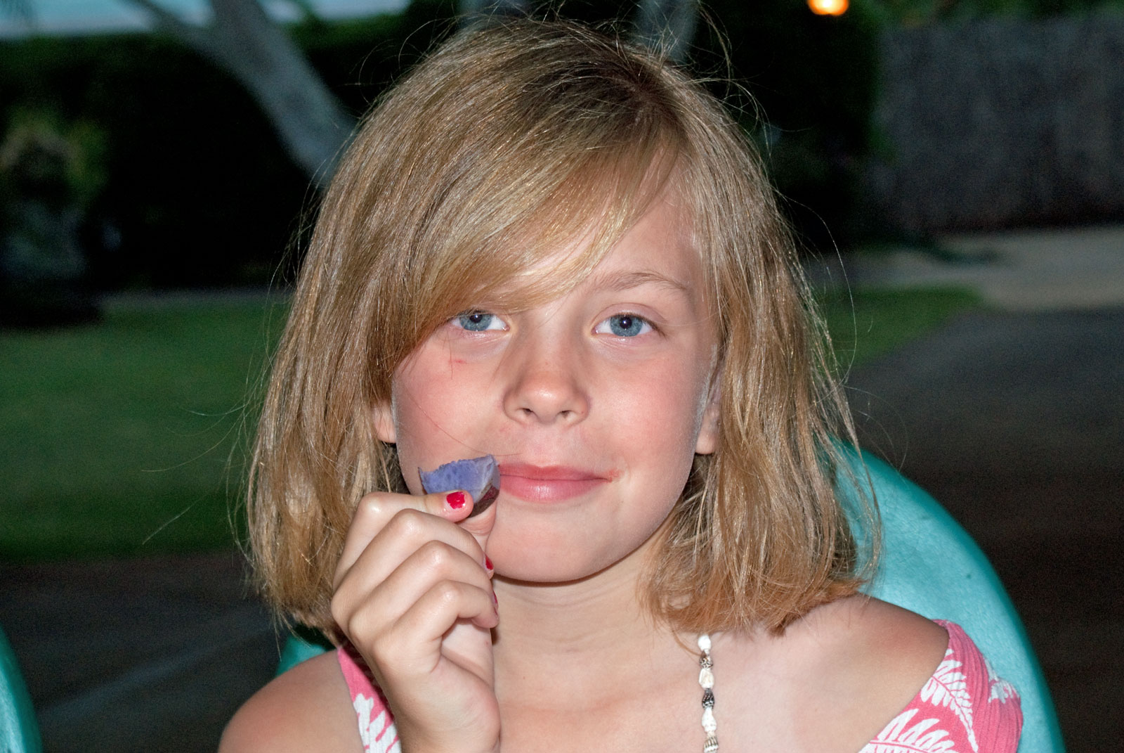 Just west of Princeville was Hanalei Bay, shown here in the distance. We went to the beach there a couple of times. Chris and Carrie test the waters at Hanalei Bay.Carrie had a blast on her boogie board.Whee!Chris enjoyed his boogie board too, although he wasn’t quite as fearless as Carrie.Chris spent most of his time at the beach building sand castles.Evidently sand castles take a lot of concentration……and occasionally the help an engineer.Our resort offered a variety of activities, including tennis lessons. Here Carrie shows off her backhand.See the ball…be the ball…you are the ball.While the kids were playing tennis, Dave and Carol relaxed in the shade of a banyan tree.Another resort activity was hula lessons.The dancers after their lesson.While the girls were learning to hula, Dave and Chris went on a walk around Princeville. Here are mountains to the west.And here is the coast and ocean to the east.As we walked we came across a plant Dave remembered from his childhood on Oahu. Commonly called sensitive plant or touch-me-not, it is shown above with the pink flowers and dark green leaves. When you touch the leaves, they fold inward toward the stalk for a few minutes.Here is a blooming Red Ginger flower.And here is a Red Tower Ginger.And the iconic Plumeria.One bit of trivia is that Kauai is infested with thousands of wild chickens. Some people call them “jungle fowl”, which has a slightly more distinguished sound to it. Unfortunately the males tend to crow all day long, not just in the morning.Red-crested Cardinals are also very common on the island.We also sighted the official state bird of Hawaii, the Nene or walking by. The Nene evolved from the Canada Goose and is now the rarest goose with less than 1000 birds in the wild.One evening we went to the Smith Family Garden Luau. Here Kamika Smith tells the guests how the pig (in the dirt-covered pit at his feet) was prepared.Chris and Carrie dressed for the occasion.Peacocks roamed the gardens around the luau. We finally realized the sound made by Kevin the snipe in the move Up is the call of a peafowl.Just before we ate, Chris wandered over to a small lake by the gardens.The meal included Purple Sweet Potatoes…there just isn’t enough blue food!During the meal some of the braver guests got on stage and danced. Carrie was able to show off the moves she learned in fer hula lesson.After the luau, we watched a show featuring traditional dances from Hawaii, Tahiti, Samoa, Philippines, New Zealand, China and Japan. It was too dark to get good pictures of the show, but some of the performers posed for a picture with Chris and Carrie afterwards.Our last big activity was a horseback ride through Silver Falls Ranch. This picture was taken just after Carol got on her horse and is the last time she was seen smiling till she dismounted. Her horse was a bit naughty and kept taking the road less traveled.Here we go toward the Kamookoa Ridge.Carrie seemed to ride like a pro.After about an hour we stopped by a small pool for a break and lunch.Chris didn’t need much prompting to jump in.Carrie, on the other hand, needed to see Chris do it a couple of times before she took a turn.Splash!We couldn’t leave Hawaii without a picture of a Hibiscus.Lunch was a simple pork and rice meal, but very tasty.The lunchtime view was pretty good too.On the way out we passed some pretty purple flowers that contrasted with the red earth and green trees.Happy Chris.On our last day we took this picture of the taro fields and distant mountains.While Dave and Carol were enjoying the view, Chris and Carrie were in their own little world.
